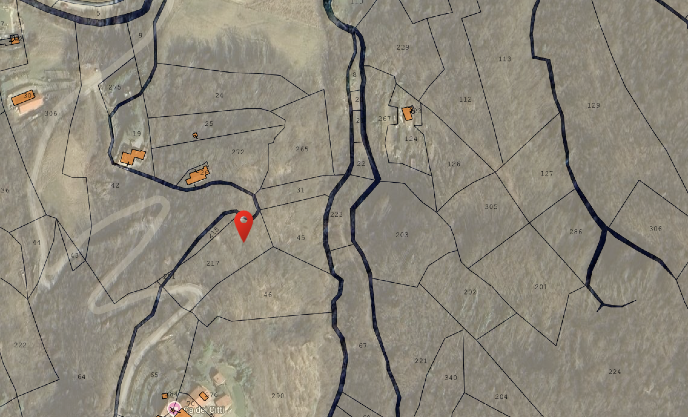 - Foglio 46, Part. 200: Terreno boschivo scosceso situato alla fonte di un torrente.